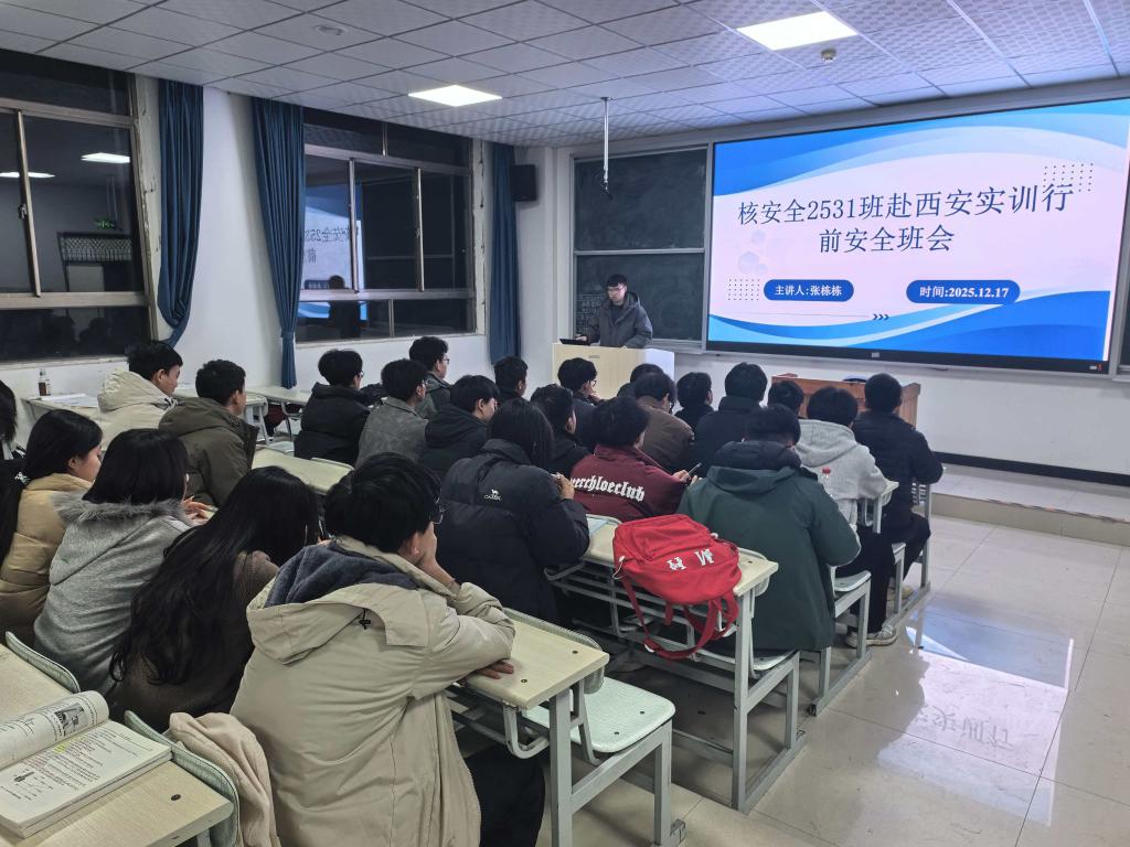 为确保《核设备认识实训》课程安全、有序开展,2025年12月21日,办公室主任马钰、核工程安全技术与管理专业主任张栋栋、及学院辅导员王晓兵,共同组织核安全2531班全体学生召开了行前安全动员大会。本次实训将于12月22日至26日在西安的相关实训基地及合作单位进行,是学生将理论联系实际的关键环节。
